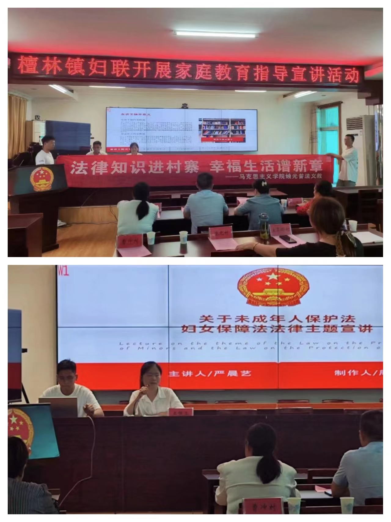 图为普法实践队员受邀为檀林镇全镇村干部家属宣讲《妇女权益保障法》、《未成年人保护法》