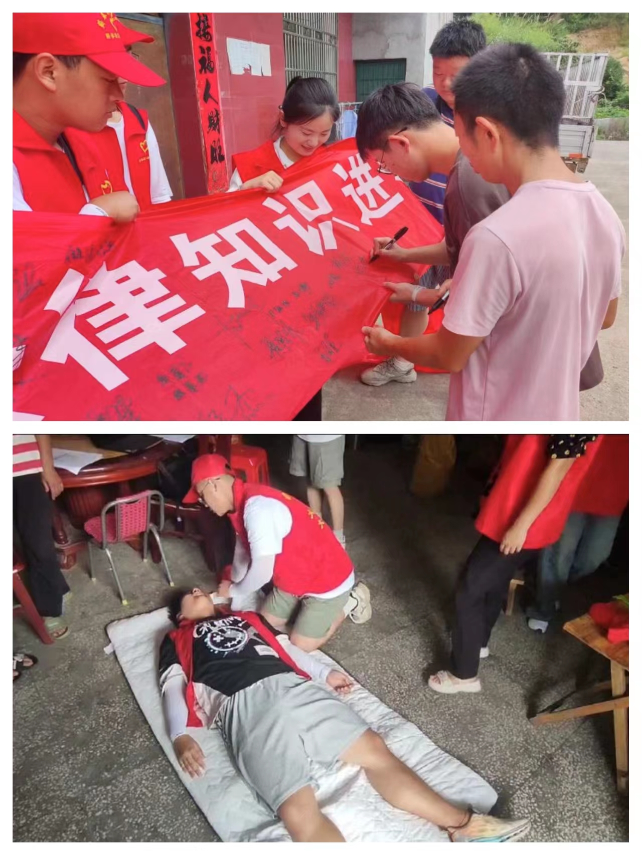 图为开展“法律知识进村寨,幸福生活谱新章”防诈骗主题签名活动和为村名演示溺水急救