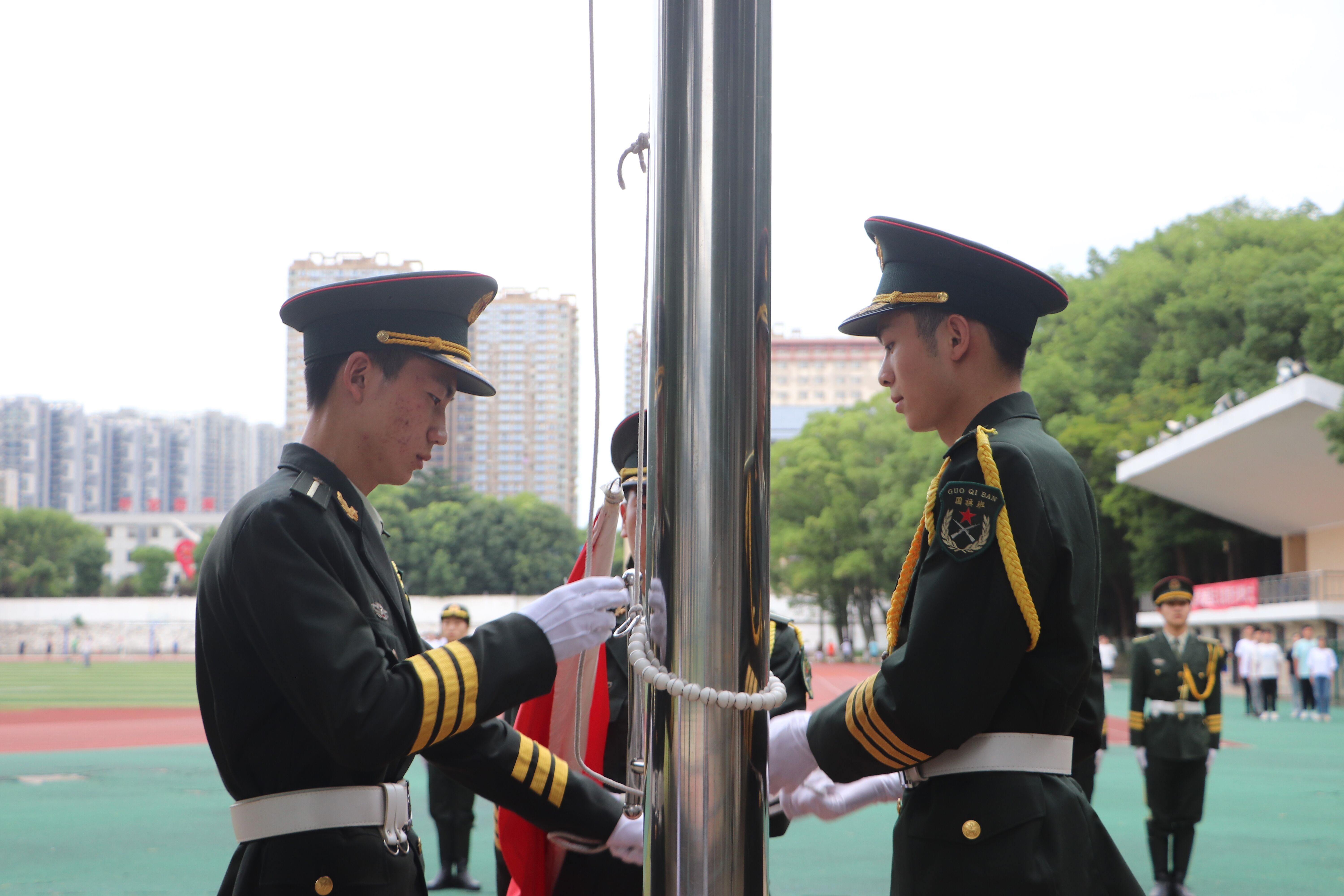 在全体师生的注目礼下,英姿飒爽的国旗护卫队队员们护送鲜艳的五星红旗进场,行礼完毕,伴随着庄严的《中华人民共和国国歌》,五星红旗冉冉升起,迎风飘扬。在场的每一个人向国旗行注目礼,深怀对祖国无限的热爱和崇高的敬意。