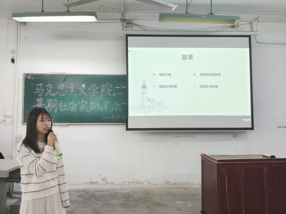 首先由王丹同学上台进行展示,她此次活动实践在湖北省宜五峰土家族自治县人民政府进行。实践展示分为四部分:自我介绍,政府工作内容,领导评价及寄语,政府工作总结。在此期间进行了整理汇总文件材料及参加会议,下乡开展考核工作等此类活动。在完成实践的同时也感悟到:把简单的事情做好你就不简单,把平凡的事情做好你就不平凡。在答辩环节,老师也对其进行了一些细节询问,让此次展示更加完整。