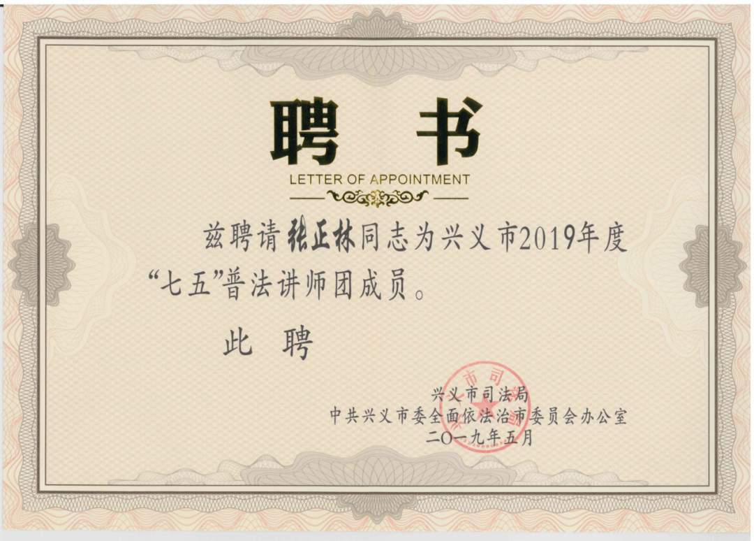 2019年5月,被兴义市司法局、中共兴义市委全面依法治市委员会办公室聘请为兴义市2019年度“七五”普法讲师团成员。