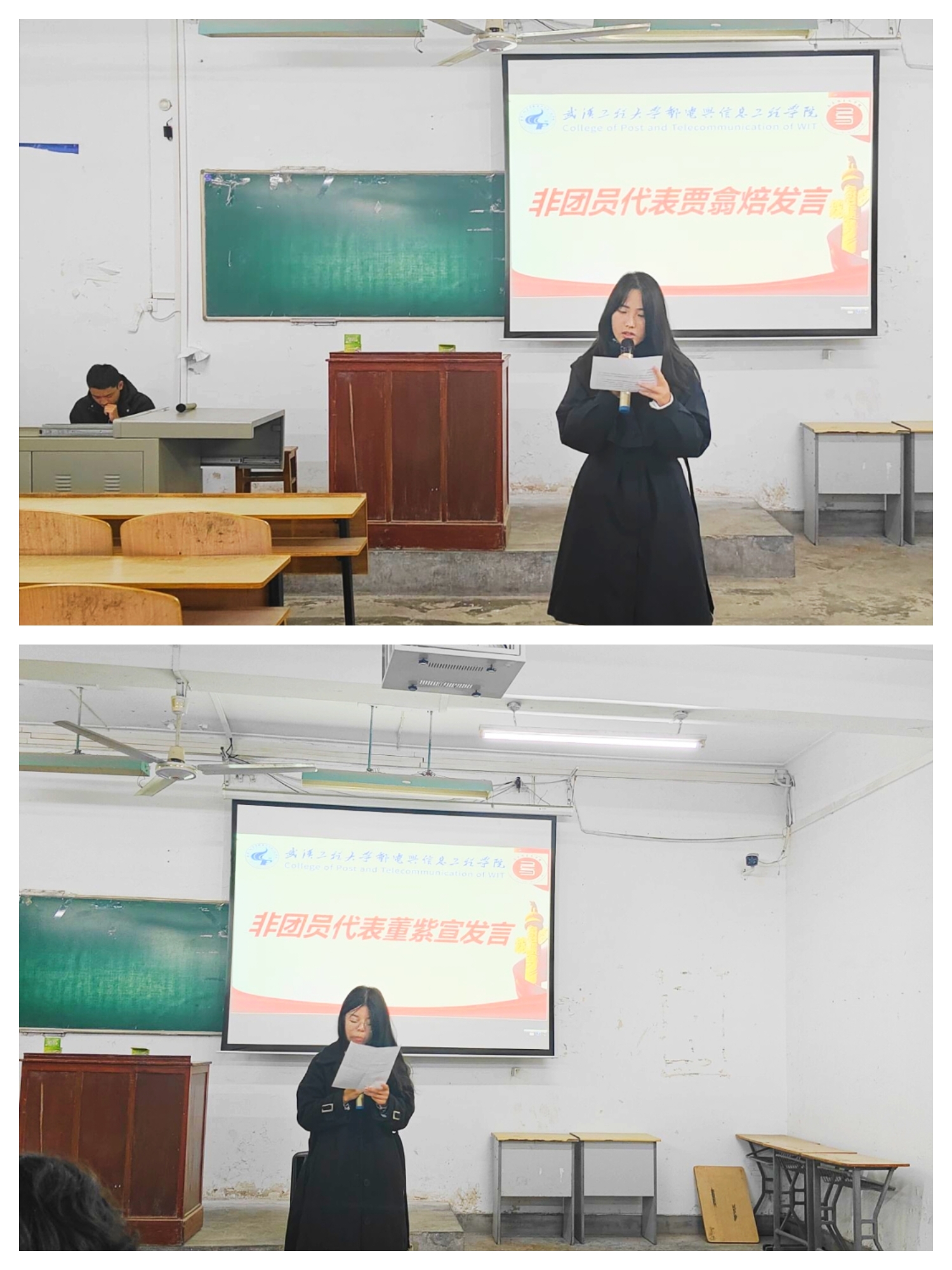 非团员代表董紫萱、贾翕焙通过入学以后自己的所见所闻,结合团课学习内容,号召同学们紧跟党团步伐,学习党的思想,努力向党团靠拢,遵守和执行党和团的指示,贯彻党和团的方针政策,在为国家为民族伟大复兴的同时实现自己的人生价值。