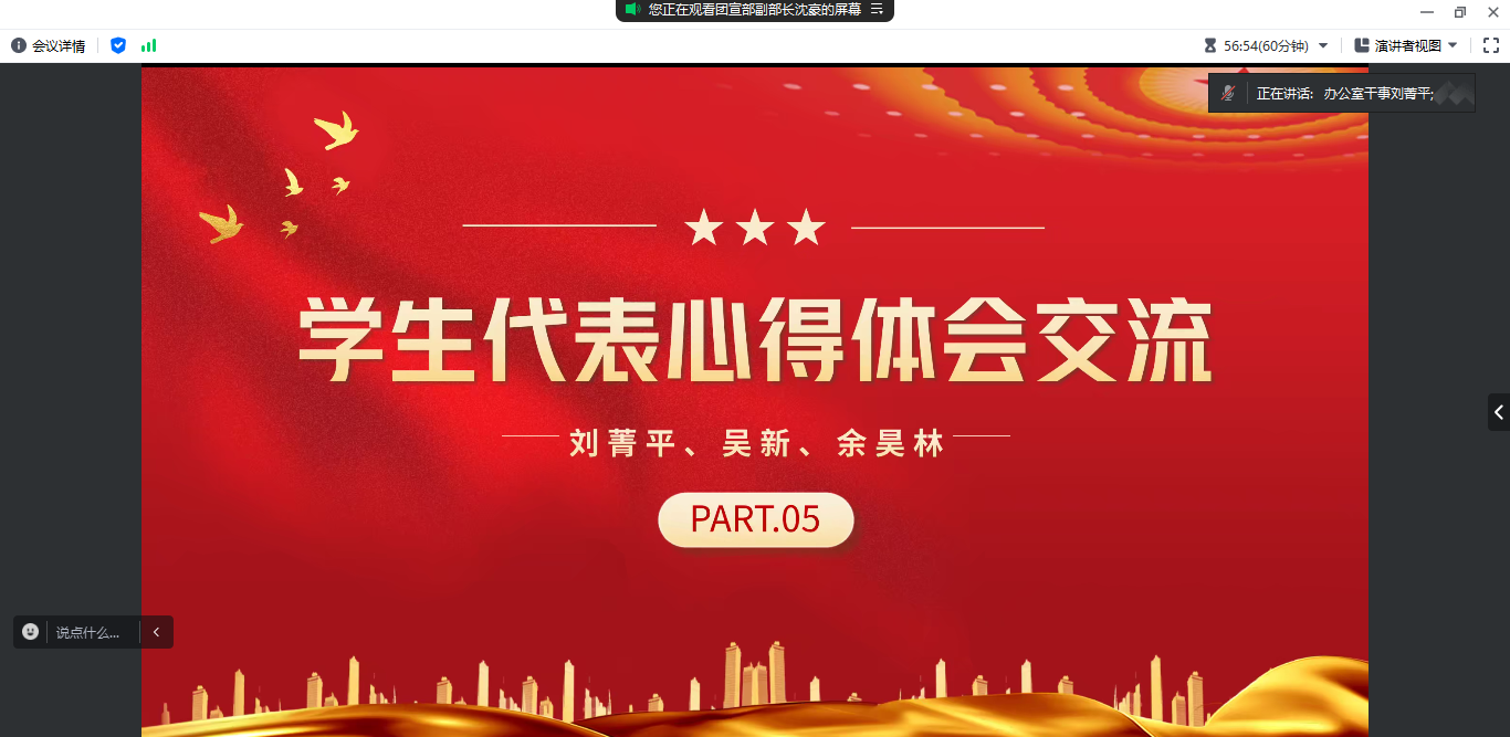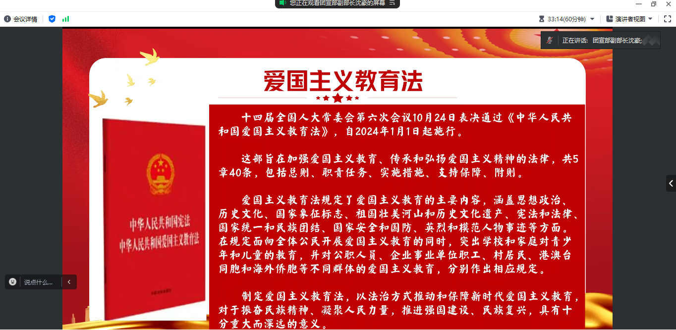 (通讯员 廖碧娇 曹浩铭)为深入学习贯彻习近平总书记关于弘扬爱国主义精神重要论述,推动爱国主义教育法落实落细,引导广大青少年深刻认识爱国、爱党、爱社会主义三位一体,有机统一在中国共产党领导的走中国特色社会主义道路的伟大实践之中,激励青少年一代增强历史责任感和使命感。2024年2月5日,球王会团总支结合寒假“返家乡”社会实践活动,召开“讲述红色故事·传承爱国之志”爱国主义主题教育线上交流分享会。公司党总支书记齐君,党总支副书记何瑞莉,团总支书记张翔,专职辅导员徐特,团总支员工会全体成员参加本次会议。会议由2022级法学02班沈豪同学主持。![]() ![]() 会上,球王会团总支书记张翔向大家介绍了老员工寒假“返家乡”社会实践活动的开展情况,指出老员工要爱家乡、爱国家,作为新时代青年要坚定理想信念,不忘来路,不忘初心。为本次分享会的开展定下了基调。 主持人沈豪对爱国主义教育法进行了详细解读,它对于振奋民族精神、凝聚民族力量、推进强国建设、民族复兴,具有十分重大而深远的意义。 ![]() ![]() ![]() ![]() 最后,公司党总支书记齐君强调爱国主义是一个人的立身之本、成长之基。一是要坚持“公司姓马、在马言马”,把爱国主义融入思政课堂,发挥好思政课的作用,夯实爱国主义教育基础;二是把爱国主义教育融入红色文化,通过形式多样的方式让它更有深度、有维度、有温度;三是把爱国主义教育融入实践养成,注重日常、经常、平常;四是把爱国主义教育融入专业学习,将爱国主义精神内化于心外化于行,做到个人理想和国家理想有机统一。 爱国主义教育是中华民族的民族心、民族魂,是中华民族最重要的精神财富,是中国人民和中华民族维护民族独立和民族尊严的强大精神动力。本次活动通过同学们讲述红色故事,激发了“强国有我”的青春激情,增强了青年学子的历史责任感和使命感。(审稿:齐君) (责任编辑:admin) |