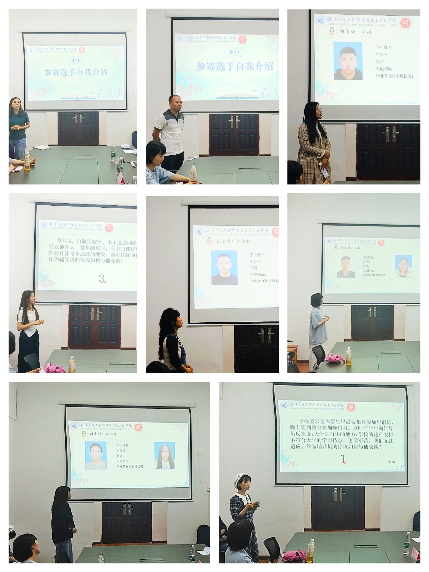 参赛选手依次上台,他们分别从自我介绍,学情考察,案例分析三个方面进行现场展示,综合体现了他们的业务水平和个人综合素质,辅导员、班主任们思维敏捷、条理清晰,抽丝剥茧、应答自如,现场表现精彩纷呈。