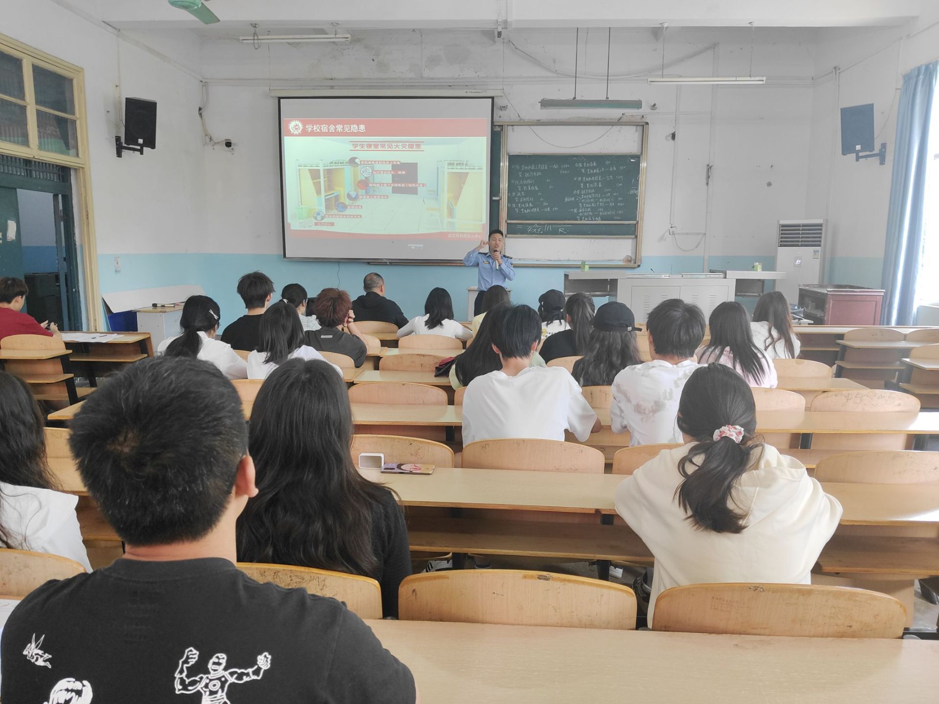 程龙教官通过现场提问的方式引发同学们对火灾事故的思考,他结合发生在我们身边的真实案例,向同学们普及了一些日常容易被忽略的消防安全知识,他详细介绍了火灾的危害性、预防措施以及紧急疏散和逃生的技巧,着重讲述了灭火器材的使用方法和操作要领。通过程教官生动形象的讲解,警示同学们在日常生活中保持高度的安全警觉,积极主动做好日常消防安全工作。