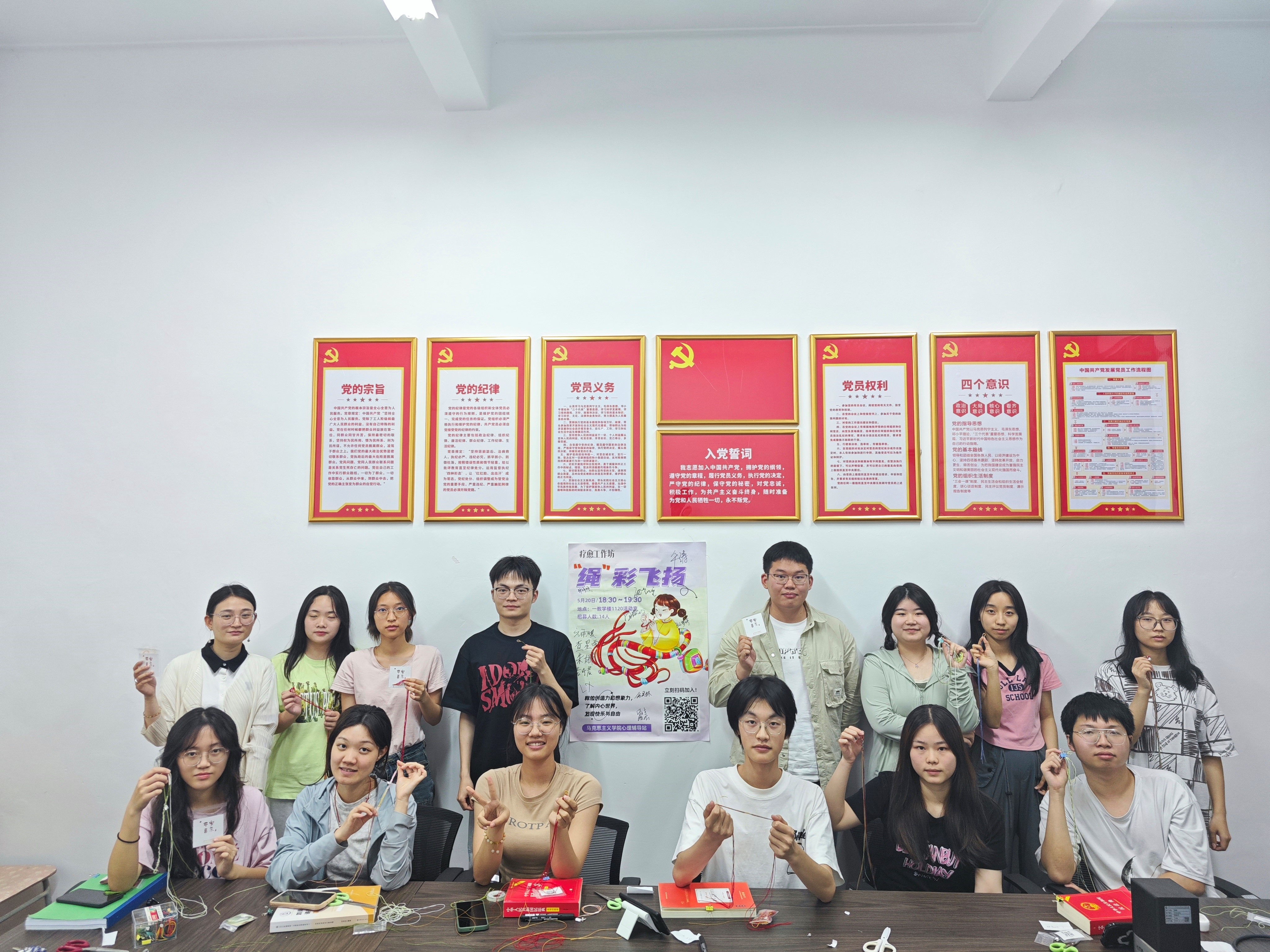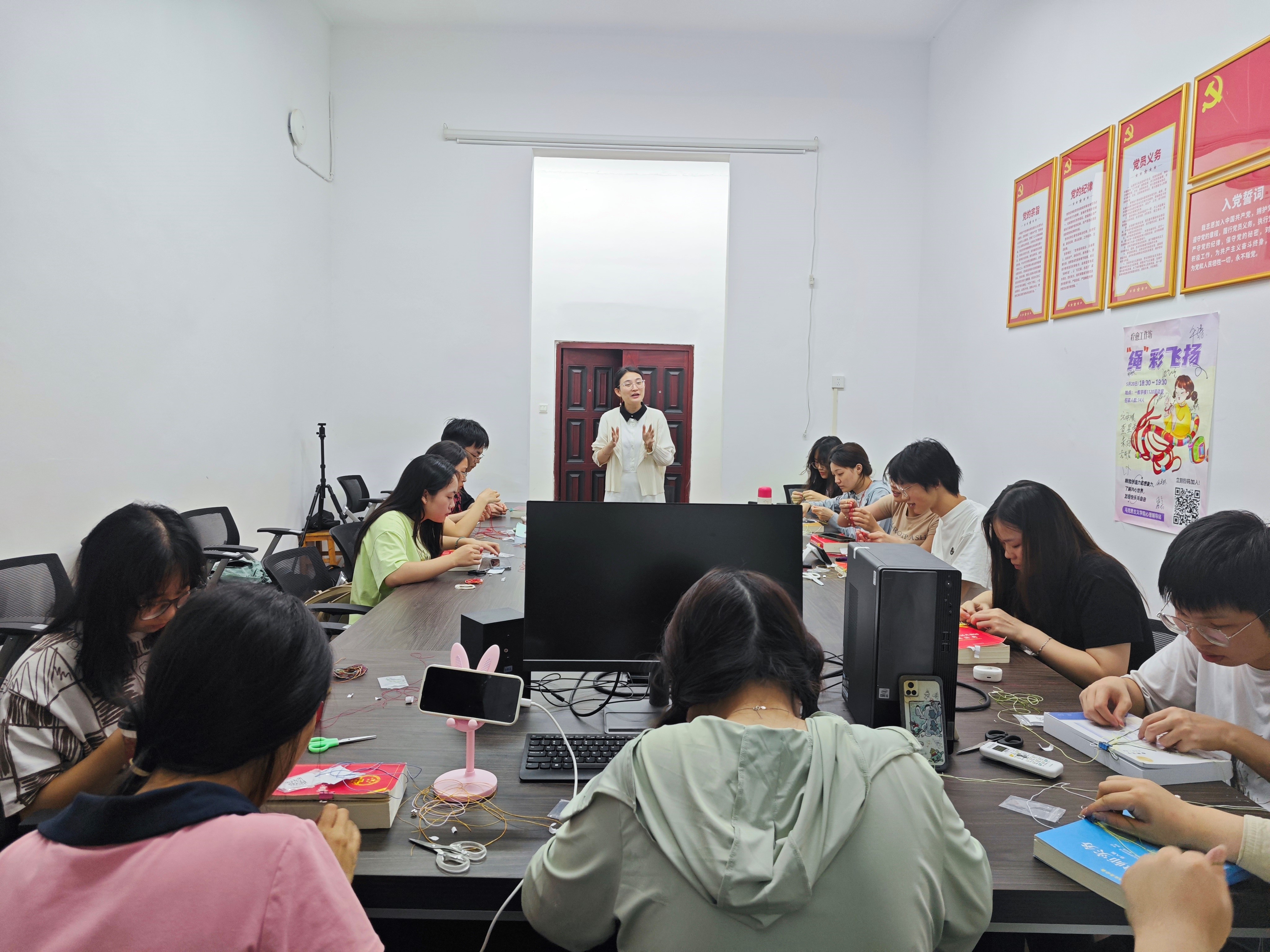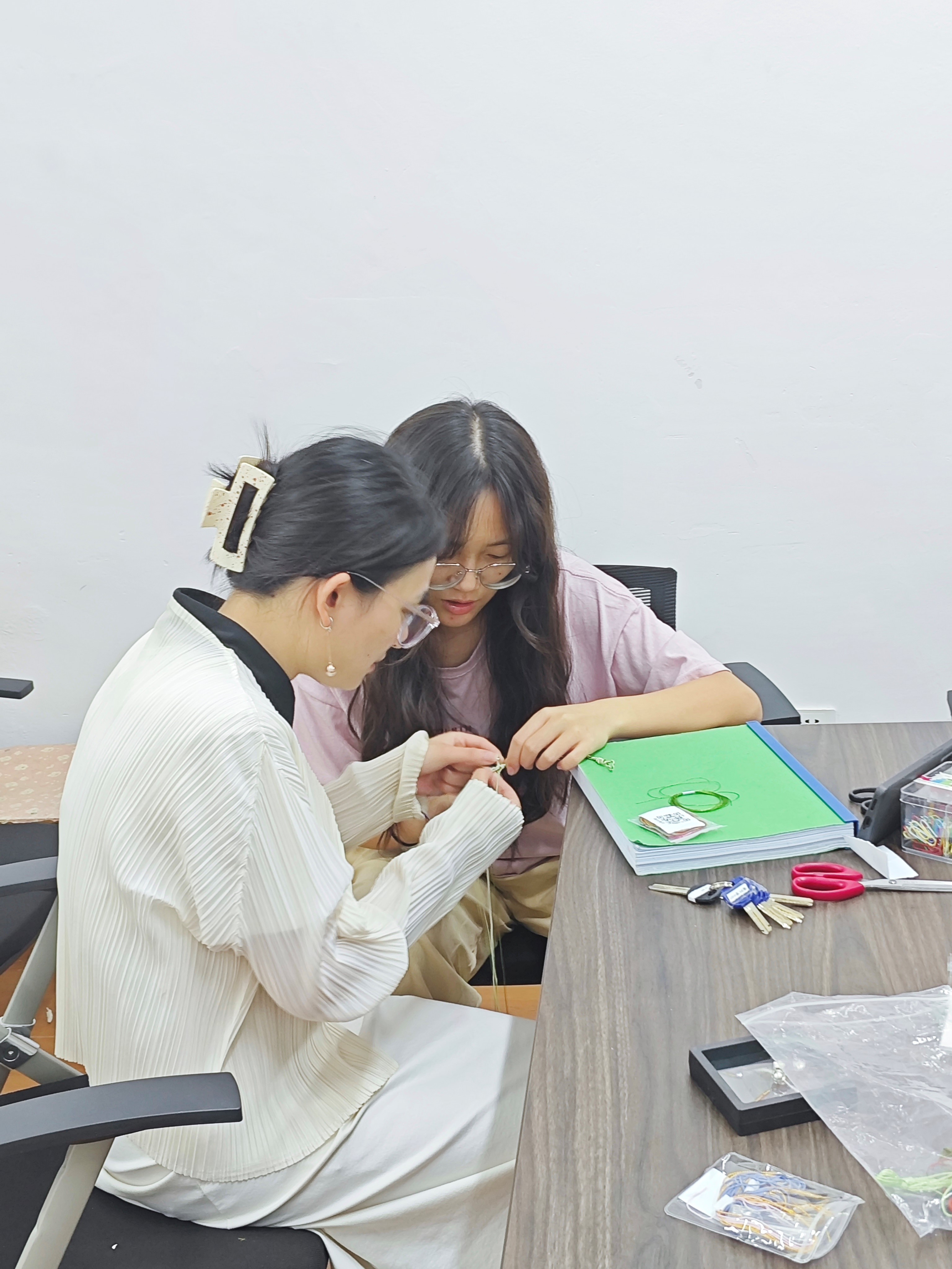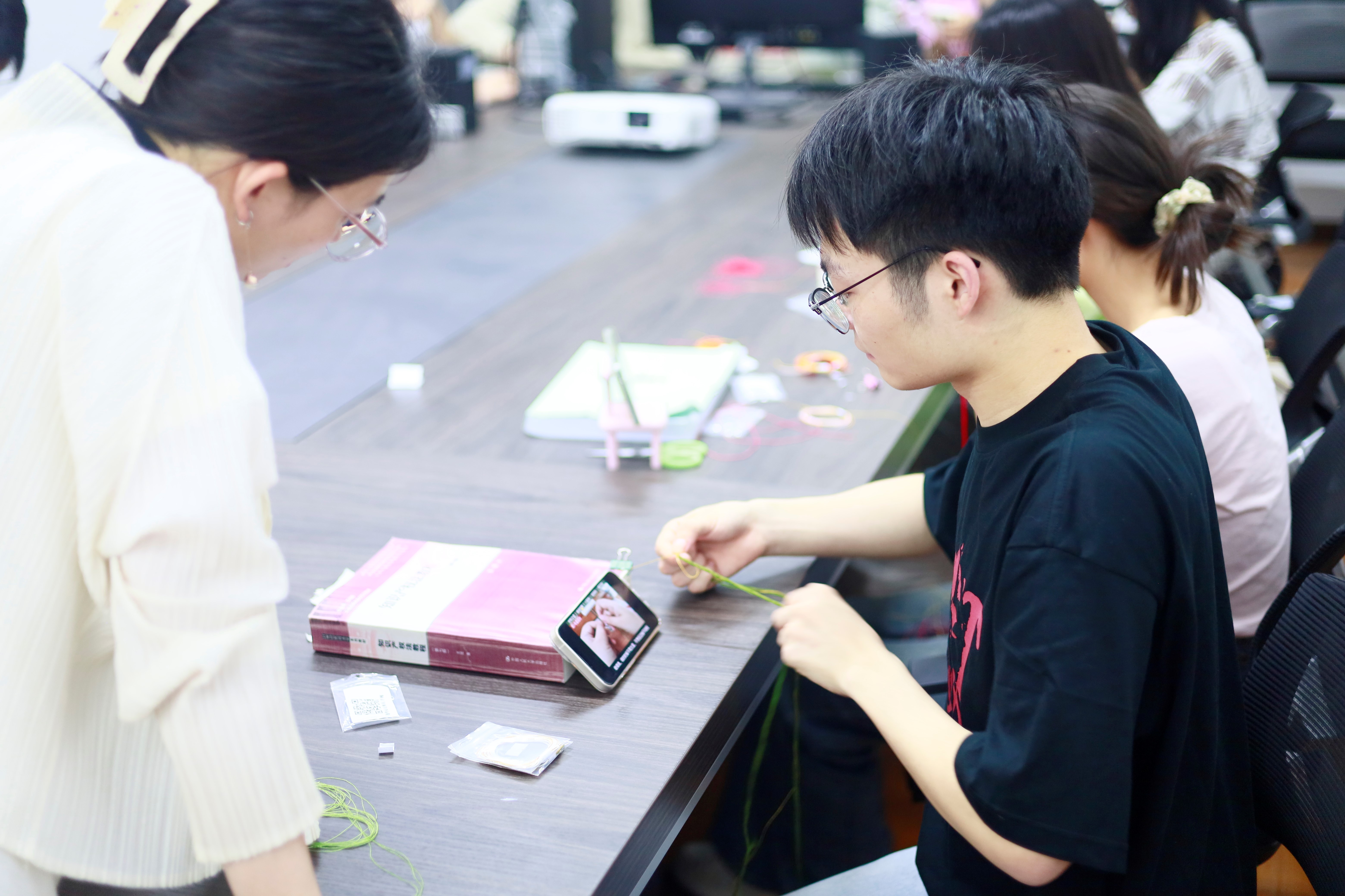 活动中,球王会心理辅导站指导老师齐君作为团辅带领者,带领同学们在享受手工DIY乐趣的过程中解压忘忧。齐老师根据制作主题进行分组,带领同学们通过表达艺术活动——手编彩绳,进一步释放创造力和想象力,了解内心世界,表达情感和想法,增强自我意识和情绪调节能力,提升情感智慧。一根根彩绳铺在面前,大家跟着视频教学,充分发挥想象力,手指飞舞间,一条条打上个人烙印的手编彩绳飞扬起来,大家也在感受治愈和放松中,可以追逐内心的平静和快乐。专注手工创作时,大家发现美,追求美,锻炼了动手能力,也通过互相探讨编绳的小技巧,互相帮助、倾听彼此,无形中拉近了彼此之间的距离,传递了温情。