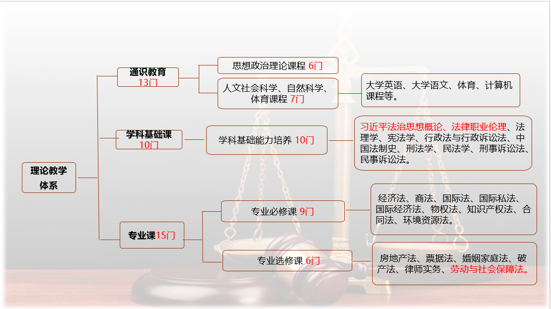 课程特色 法学专业核心课程采取“10+X”分类设置模式。10门核心课程包括:习近平法治思想概论、法律职业伦理、法理学、宪法学、行政法与行政诉讼法学、中国法制史、刑法学、民法学、刑事诉讼法、民事诉讼法。 “X”指根据办学特色开设包括:破产法、婚姻家庭法、劳动与社会保障法等特色理论课程。 ![]() ![]() 教学成果 省级精品课程《经济法》 省级一流课程《习近平新时代中国特色社会主义思想概论》 省级一流课程《思想政治理论课实践教学》 就业方向 本专业主要向员工系统传授法学基本理论和基本知识,使员工受到良好的法学思维和法律实务的基本训练,从而具有运用法学理论和方法分析问题、掌握运用法律规范管理事务与解决问题的基本技能,具有从事法律工作的基本能力。毕业后可进入国家机关特别是监察机关、审判机关从事法律工作,也可选择各企事业单位、大型公司或社会团体从事法务工作。通过司考可在律师事务所成为职业律师,更有机会参加公务员考试,成为法官、检察官等。 优秀员工代表 ![]()