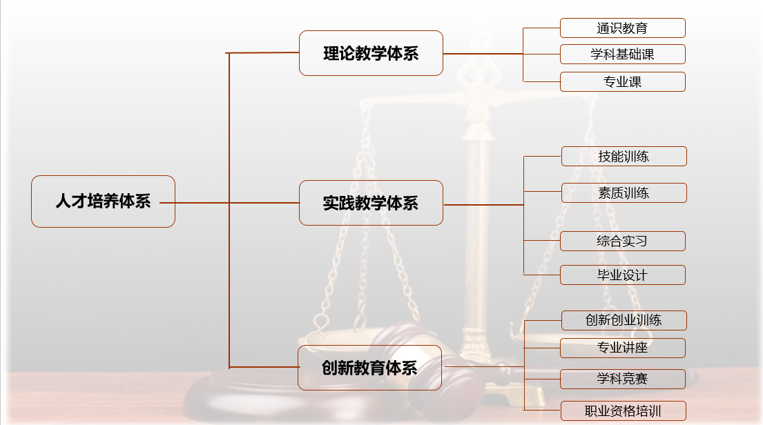 专业名称:法学 修学年限:四年 授予学位:法学学士 一、培养目标 法学专业以习近平法治思想为指导,坚持立德树人、德法兼修,融知识、能力、素质三位一体,落实“五育”并举,构建德智体美劳全面培养体系,适应建设中国特色社会主义法治体系,建设社会主义法治国家的实际需要,具有扎实的专业理论基础和熟练的职业技能、合理的知识结构,具备依法执政、科学立法、依法行政、公正司法、高效高质量法律服务能力与创新创业能力,熟悉和坚持中国特色社会主义法治体系的复合型、应用型、创新型法治人才及后备力量。 二、专业优势 1、注重实践能力培养 本专业着力于理论与实践相结合的教学方式,通过模拟法庭、法律诊所、辩论与口才以及律师实务等实践活动,真实再现案发现场,锻炼员工法律逻辑思维和表达技巧,提升就业竞争力。 2、注重创新能力培养 本专业设置学年论文实践环节,主要针对当下热门社会现象,分析背后反映的法律问题,通过导师引导员工结合国内外法律相关文献和制度,创新探索解决法律问题的途径和措施。 3、注重个性化培养与发展 为适应公司地理位置优势、特色产业发展需求,针对法学专业员工的特殊性,努力深化校企合作,有效增强专业人才培养的针对性:一方面通过课程的理论学习和“双师型”教师专项法考辅导来提升法考通过率,输出律师事务所和企业所需要的法律专业人才;另一方面通过校内实践课程,比如辩论与口才、模拟法庭等提升员工的语言表达能力,锻炼员工的社交能力,提升案件的分析能力,加强团队合作精神。创新了校企“双主体”培养人才机制,拓展了校企合作平台。 4、密切联系行业发展动态 本专业的教师队伍有着丰富的法考培训经验,近年来与多家律师事务所、专业培训机构开展校企合作,努力提升法考通过率,为毕业生提供更多的输出单位和就业机会。 ![]() ![]() 教学名师代表 ![]()